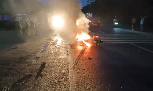 ಅಪಘಾತದ ತೀವ್ರತೆಗೆ ಬೈಕ್ಗೆ ಬೆಂಕಿ ಹತ್ತಿಕೊಂಡಿದ್ದು, ಅಗ್ನಿಶಾಮಕ ದಳದ ಸಿಬ್ಬಂದಿ ಘಟನಾ ಸ್ಥಳಕ್ಕೆ ತೆರಳಿ ಬೆಂಕಿ ನಂದಿಸಿದ್ದಾರೆ ಎಂದು ಗೊತ್ತಾಗಿದೆ.