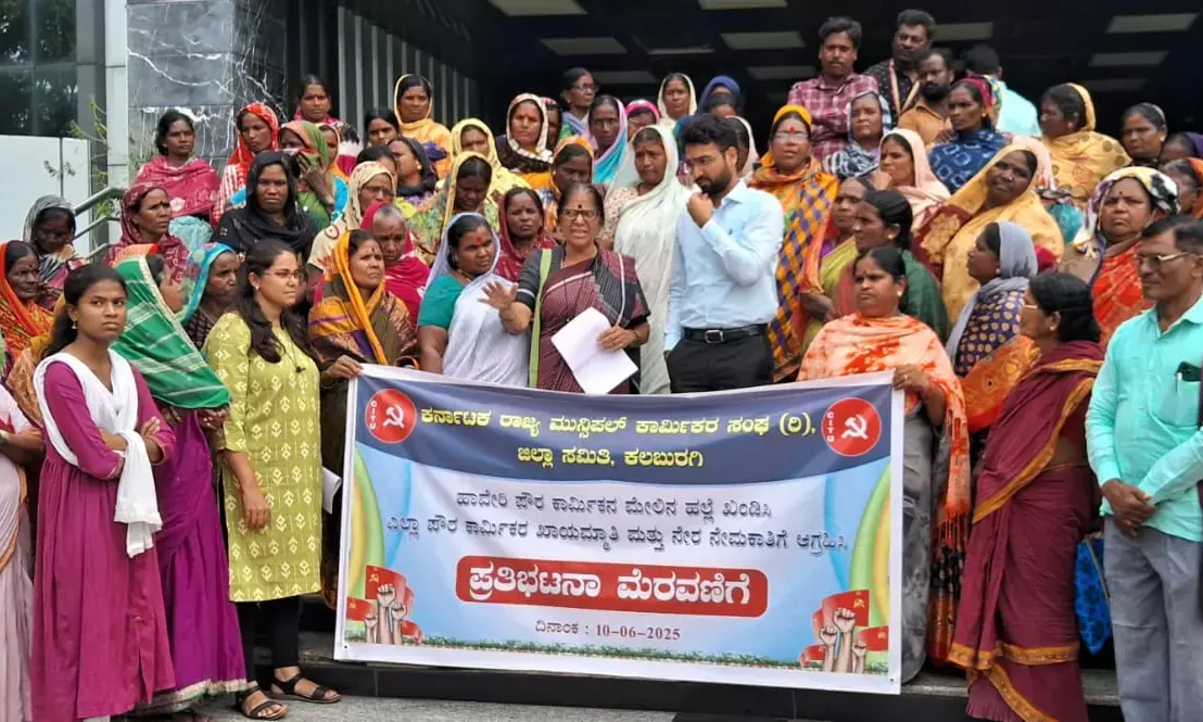 ಕಲಬುರಗಿ: ಹಾವೇರಿ ನಗರ ಸಭೆಯ ಪೌರ ಕಾರ್ಮಿಕನ ಮೇಲೆ ಹಲ್ಲೆ ನಡೆಸಿರುವುದನ್ನು ಖಂಡಿಸಿ, ಹಲ್ಲೆ ನಡೆಸಿದವರ ವಿರುದ್ಧ ಕಠಿಣ ಕ್ರಮ ಕೈಗೊಳ್ಳಬೇಕೆಂದು ಆಗ್ರಹಿಸಿ, ಕರ್ನಾಟಕ ರಾಜ್ಯ ಮುನ್ಸಿಪಲ್ ಕಾರ್ಮಿಕರ ಸಂಘದ ಜಿಲ್ಲಾ ಘಟಕದ ವತಿಯಿಂದ ನಗರದ ಮಹಾನಗರ ಪಾಲಿಕೆ ಎದುರು ಪ್ರತಿಭಟನೆ ನಡೆಸಲಾಯಿತು.
