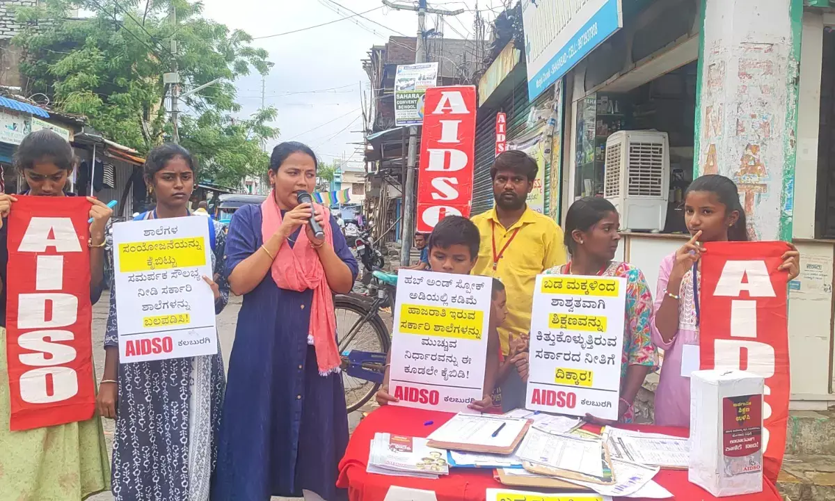 ಈ ಸಂದರ್ಭದಲ್ಲಿ ಎಐಡಿಎಸ್ಓ ಜಿಲ್ಲಾ ಉಪಾಧ್ಯಕ್ಷೆ ಪ್ರೀತಿ ದೊಡ್ಡಮನಿ ಮಾತನಾಡಿ, ರಾಜ್ಯದಲ್ಲಿ ಒಟ್ಟು 23,436 ಕಿರಿಯ ಪ್ರಾಥಮಿಕ ಶಾಲೆಗಳಲ್ಲಿ 10 ಕಡಿಮೆ ದಾಖಲಾತಿರುವ 6,000 ಶಾಲೆಗಳಿವೆ, 7,821 ಏಕೋಪಾಧ್ಯಾಯ ಶಾಲೆಗಳಿವೆ. 3,500ಕ್ಕೂ ಹೆಚ್ಚು ಶಾಲೆಗಳಲ್ಲಿ ಬಳಕೆಗೆ ಯೋಗ್ಯ ಶೌಚಾಲಯ ವ್ಯವಸ್ಥೆ ಇಲ್ಲ ಹಲವು ಶಾಲೆಗಳ ಕಟ್ಟಡಗಳು ವರ್ಷಗಳಿಂದ ದುರಸ್ತಿ ಕಾಣದೆ ಚಾವಣೆಗಳು ಸೋರುತ್ತಿವೆ ಎಲ್ಲದಕ್ಕಿಂತ ಮುಖ್ಯವಾಗಿ ರಾಜ್ಯದ ಸರ್ಕಾರಿ ಶಾಲೆಗಳಲ್ಲಿ 59 ಸಾವಿರಕ್ಕೂ ಹೆಚ್ಚು ಶಿಕ್ಷಕರ ಹುದ್ದೆಗಳು ಖಾಲಿ ಇವೆ ಎಂದರು.