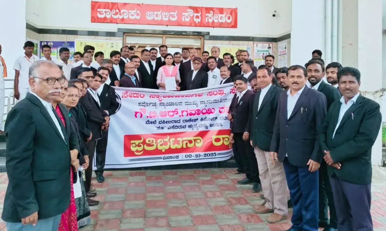 ಕಲಬುರಗಿ: ಸುಪ್ರೀಂ ಕೋರ್ಟಿನ ಮುಖ್ಯ ನ್ಯಾಯಾಧೀಶರಾದ ಬಿ.ಆರ್ ಗವಾಯಿ ಅವರ ಮೇಲೆ ಶೂ ಎಸೆದಿರುವ ಪ್ರಕರಣಕ್ಕೆ ಸಂಬಂಧಿಸಿದಂತೆ ಆರೋಪಿ ವಕೀಲ ಕಿಶೋರ್ ರಾಕೇಶ್ ವಿರುದ್ಧ ಸೂಕ್ತ ಕ್ರಮ ಕೈಗೊಳ್ಳುವಂತೆ ಒತ್ತಾಯಿಸಿ ಸೇಡಂನಲ್ಲಿ ನ್ಯಾಯವಾದಿಗಳ ಸಂಘದ ನೇತೃತ್ವದಲ್ಲಿ ಪ್ರತಿಭಟನೆ ನಡೆಸಿ, ಸೇಡಂ ತಹಶೀಲ್ದಾರ್ ಮುಖಾಂತರ ರಾಷ್ಟ್ರಪತಿಗಳಿಗೆ ಮನವಿ ಪತ್ರ ಸಲ್ಲಿಸಲಾಯಿತು.