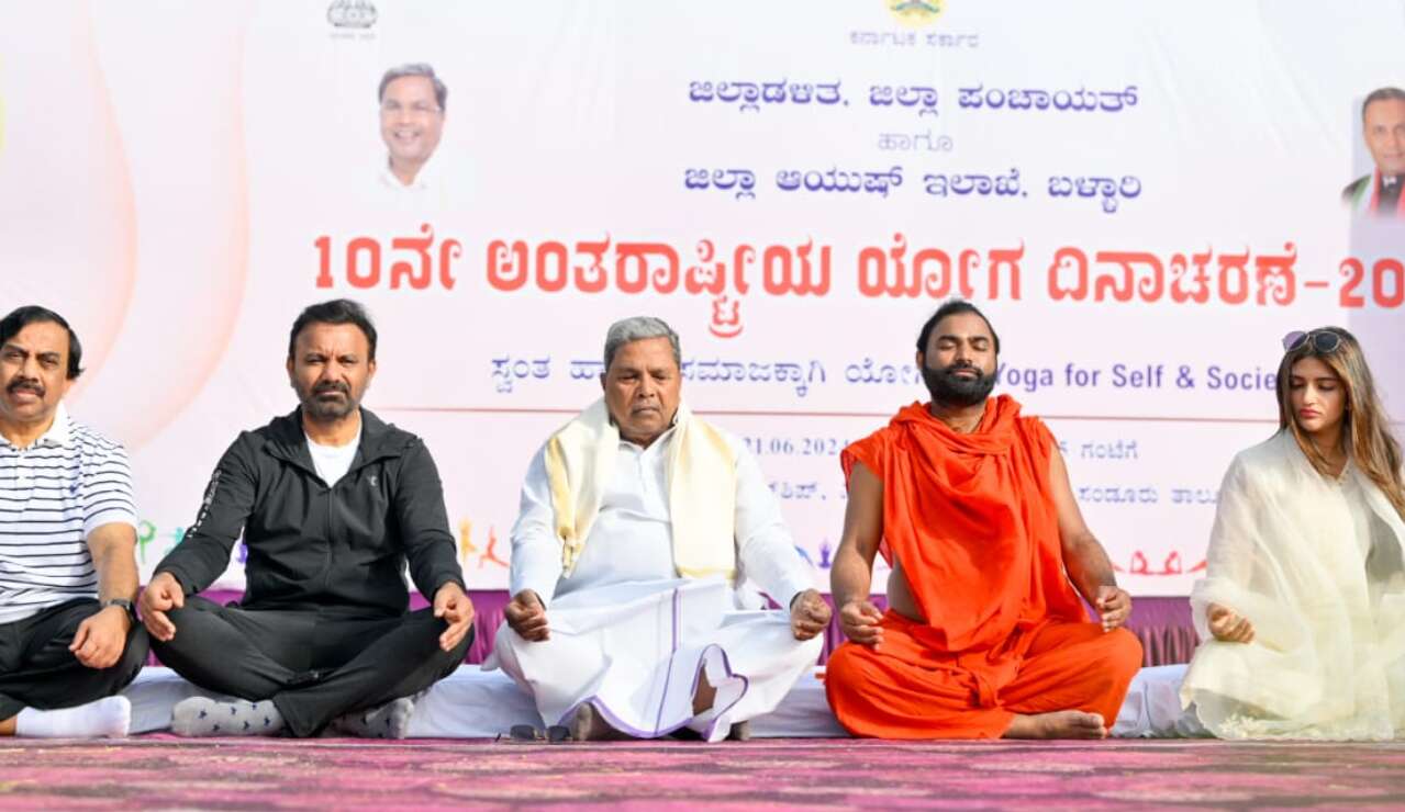 ಸಿಎಂ ಭಾಗಿ: ಬಳ್ಳಾರಿಯಲ್ಲಿ ಆಯೋಜಿಸಿದ್ದ ಯೋಗದಿನದಲ್ಲಿ ಮುಖ್ಯಮಂತ್ರಿ ಸಿದ್ದರಾಮಯ್ಯ ಪಾಲ್ಗೊಂಡರು. ಈ ಸಂದರ್ಭದಲ್ಲಿ ಸಚಿವ ಸಂತೋಷ್ ಲಾಡ್, ಸಿಎಂ ರಾಜಕೀಯ ಕಾರ್ಯದರ್ಶಿ ಗೋವಿಂದರಾಜು, ಸಂಸದ ಈ.ತುಕಾರಾಂ, ಸರಕಾರದ ಕಾರ್ಯದರ್ಶಿ ತ್ರಿಲೋಕ್ ಚಂದ್ರ, ನಟಿ ಶ್ರೀಲೀಲಾ, ವಚನಾನಂದ ಸ್ವಾಮೀಜಿ ಸೇರಿದಂತೆ ಪ್ರಮುಖರಿದ್ದರು.