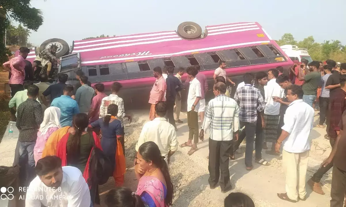 ಕಾಸರಗೋಡು: ಖಾಸಗಿ ಬಸ್ಸೊಂದು ಮಗುಚಿ ಬಿದ್ದ ಪರಿಣಾಮ ಚಾಲಕ ಮೃತಪಟ್ಟು, ವಿದ್ಯಾರ್ಥಿಗಳು ಸೇರಿದಂತೆ 20 ಮಂದಿ ಗಾಯಗೊಂಡ ಘಟನೆ ರಾಷ್ಟ್ರೀಯ ಹೆದ್ದಾರಿಯ ಚಾಲಿಂಗಾಲ್ ನಲ್ಲಿ ಸೋಮವಾರ ಸಂಜೆ ನಡೆದಿದೆ.