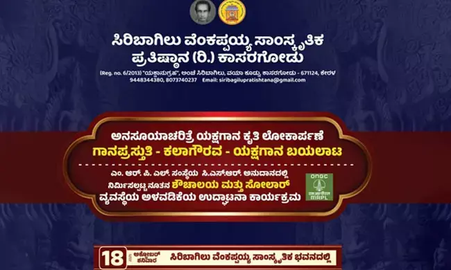 ಕಾಸರಗೋಡು: ಪುರಂದರದಾಸರ ಅನಸೂಯಾ ಚರಿತ್ರೆ ಯಕ್ಷಗಾನ ಕೃತಿ ಲೋಕಾರ್ಪಣೆ -ಗಾನ ಪ್ರಸ್ತುತಿ- ಕಲಾ ಗೌರವ -ಯಕ್ಷಗಾನ ಬಯಲಾಟ -ಎಂ.ಆರ್.ಪಿ.ಎಲ್.ಅನುದಾನದ ಶೌಚಾಲಯ,ಸೋಲಾರ್ ವ್ಯವಸ್ಥೆಯ ಉದ್ಘಾಟನೆ ಕಾರ್ಯಕ್ರಮ ಅ.18 ಶನಿವಾರ ಸಿರಿಬಾಗಿಲು ಪ್ರತಿಷ್ಠಾನದಲ್ಲಿ ನಡೆಯಲಿದೆ.