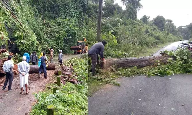 ಮಡಿಕೇರಿ ತಾಲ್ಲೂಕಿನ ಕರಿಕೆ- ಭಾಗಮಂಡಲ ರಸ್ತೆಯಲ್ಲಿ ಬೃಹತ್ ಮರ ಬಿದ್ದು ವಾಹನ ಸಂಚಾರ ಸ್ಥಗಿತಗೊಂಡಿತ್ತು. ನಂತರ ತೆರವು ಕಾರ್ಯಾಚರಣೆ ನಡೆಯಿತು. ಕರಿಕೆಯ ಕುಂಡತ್ತಿಕಾನ ಗ್ರಾಮದಲ್ಲಿ ಕೆ.ಎಸ್.ಗಣೇಶ ಎಂಬುವವರ ಮನೆ ಮೇಲೆ ಅಡಿಕೆ ಮರ ಬಿದ್ದು ಹಾನಿಯಾಗಿದೆ. ಮನೆಯವರು ಅಪಾಯದಿಂದ ಪಾರಾಗಿದ್ದಾರೆ.