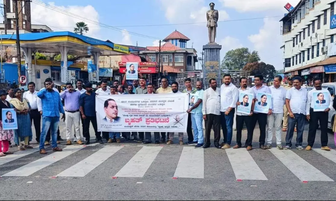 “ಅಂಬೇಡ್ಕರ್ ಹೆಸರು ನಮಗೆ ಶೋಕಿಯಲ್ಲ, ಸ್ಮರಣೆ, ಅಸ್ಮಿತೆ, ಬದುಕು” ಎನ್ನುವ ಘೋಷವಾಕ್ಯದಡಿ ದಲಿತ ಸಂಘಟನೆಗಳ ಒಕ್ಕೂಟ, ಸಮಾನ ಮನಸ್ಕರ ವೇದಿಕೆ ಮತ್ತು ಪ್ರಗತಿಪರ ಚಿಂತಕರ ಒಕ್ಕೂಟ ಮಾನವ ಸರಪಳಿ ರಚಿಸಿ ರಸ್ತೆತಡೆ ಪ್ರತಿಭಟನೆ ನಡೆಸಿದವು.