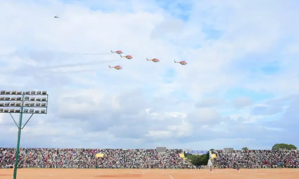ಕೆಂಪು ಮತ್ತು ಬಿಳಿ ಬಣ್ಣದ ಹೊಗೆಯನ್ನಾರಿಸುವುದರ ಜೊತೆಗೆ ಬೆಂಕಿಯ ಉಂಡೆಗಳನ್ನು ಉಗುಳುತ್ತಾ ನಾ ಮುಂದೆ, ನೀ ನನ್ನ ಹಿಂದೆ ಎಂಬಂತೆ ಬಾನಂಗಳದಲ್ಲಿ ಲೋಹದ ಹಕ್ಕಿಗಳು ವೈಮಾನಿಕ ಹಾರಾಟದ ಮೂಲಕ ತನ್ನ ಯಶಸ್ಸು ಮತ್ತು ಧೈರ್ಯವನ್ನು ಪ್ರದರ್ಶಿಸುತ್ತಿದ್ದರೆ, ಇತ್ತ ಮೈಸೂರಿನ ಜನರು ಶಿಳ್ಳೆ, ಚಪ್ಪಾಳೆ ಹಾಗೂ ಜೋರಾದ ಚೀತ್ಕಾರದೊಂದಿಗೆ ಸಂಭ್ರಮಿಸಿದರು.