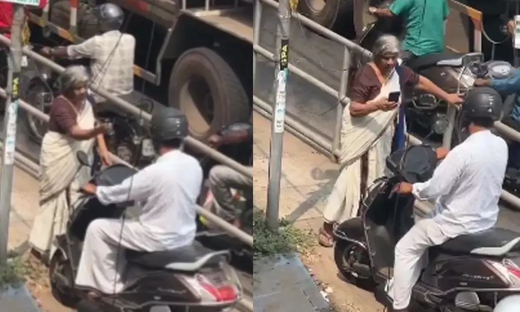 Kerala | ಟ್ರಾಫಿಕ್ ಸಿಗ್ನಲ್ ಜಂಪ್ ಮಾಡಲು ಫುಟ್ಪಾತ್ ಮೇಲೇರಿದ ಸವಾರನನ್ನು ತಡೆದ ವೃದ್ಧೆ