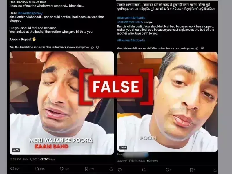 ಎಕ್ಸ್ನಲ್ಲಿನ ಪೋಷ್ಟ್ಗಳ ಸ್ಕ್ರೀನ್ಶಾಟ್ಗಳು ಇನ್ಫ್ಲುಯೆನ್ಸರ್ ರಣವೀರ್ ಅಲ್ಲಾಬಾಡಿಯಾ ಅವರ ವೀಡಿಯೋವನ್ನು ಹಂಚಿಕೊಳ್ಳುತ್ತವೆ, ಇಂಡಿಯಾಸ್ ಗಾಟ್ ಟ್ಯಾಲೆಂಟ್ ಬಗ್ಗೆ ಅವರ ಕಾಮೆಂಟ್ ಹೇಗೆ ಕೆಲಸ ಮಾಡಿತು ಎಂಬುದರ ಕುರಿತು ಕಣ್ಣೀರು ಸುರಿಸುತ್ತಿದ್ದಾರೆ. (ಮೂಲ: ಎಕ್ಸ್/ಲಾಜಿಕಲಿ ಫ್ಯಾಕ್ಟ್ಸ್ ನಿಂದ ಮಾರ್ಪಡಿಸಲಾಗಿದೆ)