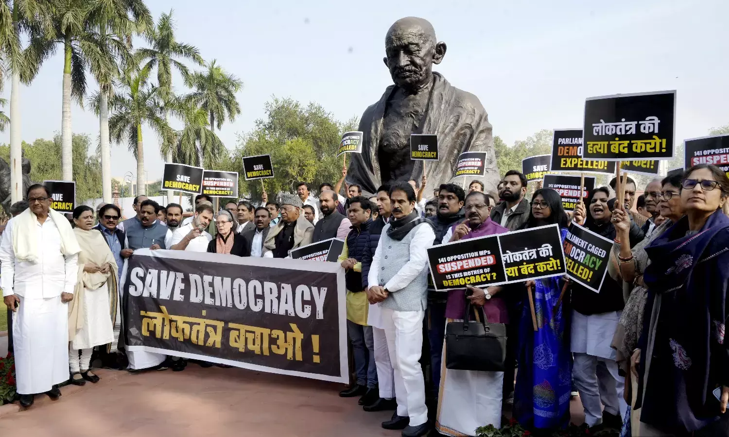 ಸಂಸತ್ತಿನ ಭದ್ರತಾ ಉಲ್ಲಂಘನೆ ಘಟನೆ ಕುರಿತಂತೆ ಕೇಂದ್ರ ಸಚಿವ ಅಮಿತ್ ಶಾ ಅವರು ಹೇಳಿಕೆ ನೀಡುವಂತೆ ಆಗ್ರಹಿಸಿ ಪ್ರತಿಪಕ್ಷದ ಸಂಸದರು ದಾಂಧಲೆ ನಡೆಸಿದ ಆರೋಪದಲ್ಲಿ ಲೋಕಸಭೆಯಿಂದ 95 ಹಾಗೂ ರಾಜ್ಯ ಸಭೆಯಿಂದ 46 ಹೀಗೆ ಒಟ್ಟು 141 ಸಂಸದರನ್ನು ಅಮಾನತುಗೊಳಿಸಲಾಗಿತ್ತು.