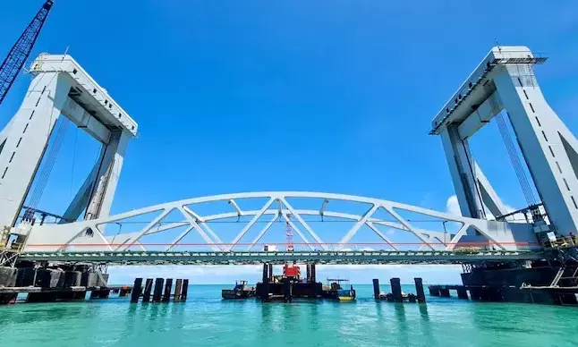 ರಾಮೇಶ್ವರಂ: ಇಂದು ಪ್ರಧಾನಿ ನರೇಂದ್ರ ಮೋದಿ ರಾಮೇಶ್ವರಂನಲ್ಲಿ ನಿರ್ಮಿಸಲಾಗಿರುವ ಭಾರತದ ಮೊಟ್ಟಮೊದಲ ವರ್ಟಿಕಲ್ ಲಿಫ್ಟ್ ಸಮುದ್ರ ಸೇತುವೆಯನ್ನು ಉದ್ಘಾಟಿಸಿದರು.