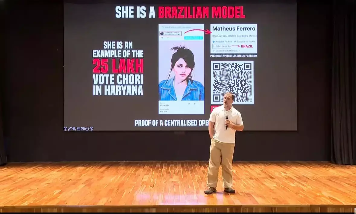 ಮತದಾರರ ಪಟ್ಟಿಯಲ್ಲಿನ ವ್ಯತ್ಯಾಸಗಳ ಕುರಿತು ಮಾಹಿತಿ ಪ್ರದರ್ಶಿಸಿದ ರಾಹುಲ್ ಗಾಂಧಿ, ಒಂದು ವಿಚಿತ್ರ ಉದಾಹರಣೆಯನ್ನು ತೋರಿಸಿದರು. “ಬ್ರೆಝಿಲ್ನ ರೂಪದರ್ಶಿಯೊಬ್ಬಳ ಫೋಟೋ ಹರ್ಯಾಣದ ಮತದಾರರ ಪಟ್ಟಿಯಲ್ಲಿ ‘ಸೀಮಾ’, ‘ಸ್ವೀಟಿ’, ‘ಸರಸ್ವತಿ’ ಎಂಬ ಹೆಸರುಗಳಲ್ಲಿ 22 ಬಾರಿ ಕಾಣಿಸಿಕೊಂಡಿದೆ,” ಎಂದು ಅವರು ಆರೋಪಿಸಿದರು.
