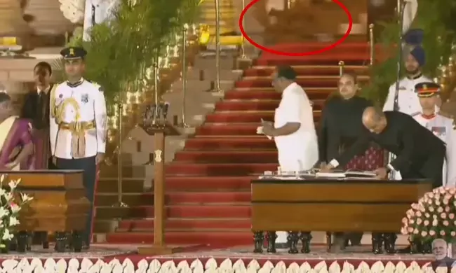 ಹೊಸದಿಲ್ಲಿ: ರವಿವಾರ ರಾಷ್ಟ್ರಪತಿ ಭವನದಲ್ಲಿ ಭವ್ಯ ಸಮಾರಂಭದಲ್ಲಿ ಪ್ರಧಾನಿ ನರೇಂದ್ರ ಮೋದಿ ಮತ್ತು ಅವರ ಸಚಿವ ಸಂಪುಟದ ಪ್ರಮಾಣವಚನ ಸ್ವೀಕಾರ ಸಮಾರಂಭ ನಡೆಯುತ್ತಿರುವ ವೇಳೆ ನಿಗೂಢ ಪ್ರಾಣಿಯೊಂದು ಕ್ಯಾಮೆರಾ ಕಣ್ಣಲ್ಲಿ ಸೆರೆಯಾಗಿದ್ದು ಅದೀಗ ವೈರಲ್ ಆಗಿದೆ.