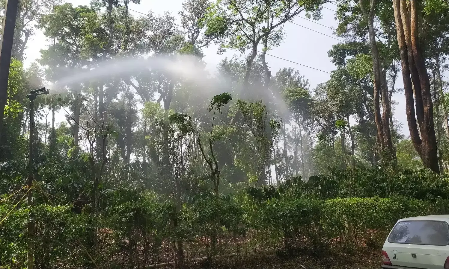 ಬಿಸಿಲಿನ ಬೇಗೆಯಿಂದ ಕಾಫಿ ಗಿಡಗಳು, ಕಾಳುಮೆಣಸು ಬಳ್ಳಿಗಳನ್ನು ಉಳಿಸಿಕೊಳ್ಳುವ ಅನಿವಾರ್ಯತೆ ಬೆಳೆಗಾರರಿಗೆ ಎದುರಾಗಿದ್ದು, ಸಾವಿರಾರು ರೂ. ಖರ್ಚು ಮಾಡಿ ಮೋಟರ್ ಪಂಪ್ ಬಳಸಿ ಸ್ಪ್ರಿಂಕ್ಲರ್ ಮೂಲಕ ಕಾಫಿ ತೋಟಗಳಿಗೆ ನೀರು ಹಾಯಿಸುತ್ತಿದ್ದಾರೆ. ಕಾಫಿ ಕೊಯ್ಲು ಬಹುತೇಕ ಪೂರ್ಣಗೊಂಡಿದ್ದು, ಬಿಸಿಲಿನ ಝಳಕ್ಕೆ ಕಾಫಿ ಗಿಡಗಳು ಒಣಗುತ್ತಿದ್ದು, ಕೃತಕವಾಗಿ ನೀರು ಹಾಯಿಸಿ ಮುಂದಿನ ವರ್ಷಕ್ಕೆ ಕಾಫಿ ಫಸಲನ್ನು ಬೆಳೆಗಾರರು ಉಳಿಸಲು ಮುಂದಾಗಿದ್ದಾರೆ. ಕೆರೆ, ಬೋರ್ವೆಲ್ ನೀರು ಬಳಸಿ ಸ್ಪ್ರಿಂಕ್ಲರ್ ಮೂಲಕ ನೀರು ಹಾಯಿಸುತ್ತಿರುವುದರಿಂದ ಕಾಫಿ ಹೂವು ಕೂಡ ಅರಳಿವೆ.
