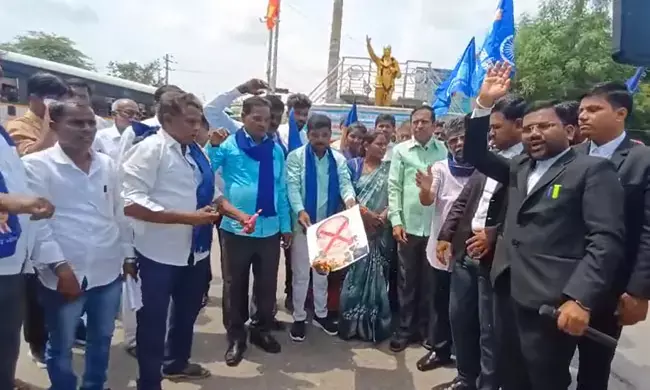ನಗರದ ಡಾ.ಬಿ.ಆರ್ ಅಂಬೇಡ್ಕರ್ ವೃತ್ತದಲ್ಲಿ ಪ್ರತಿಭಟನೆ ನಡೆಸಿ ರಾಕೇಶ್ ಕಿಶೋರ್ ಪೋಟೊ ದಹಿಸಿ ಆಕ್ರೋಶ ವ್ಯಕ್ತಪಡಿಸಿದರು.