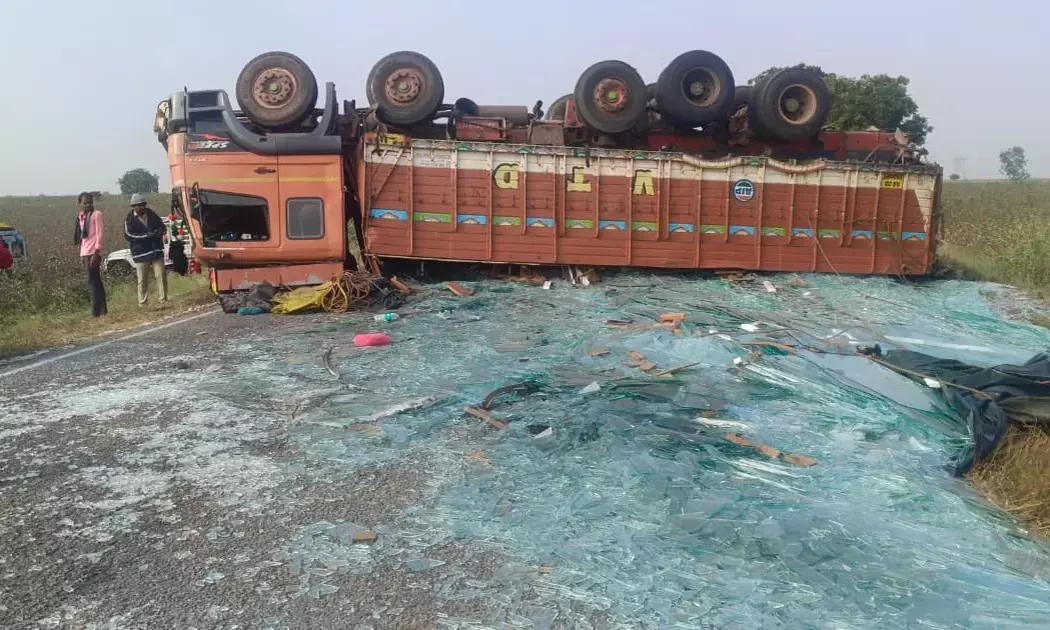 Raichur | ರಸ್ತೆ ಮಧ್ಯೆ ಅಡ್ಡಲಾಗಿ ಪಲ್ಟಿಯಾದ ಗಾಜು ತುಂಬಿದ್ದ ಲಾರಿ; ಇಬ್ಬರಿಗೆ ಗಾಯ