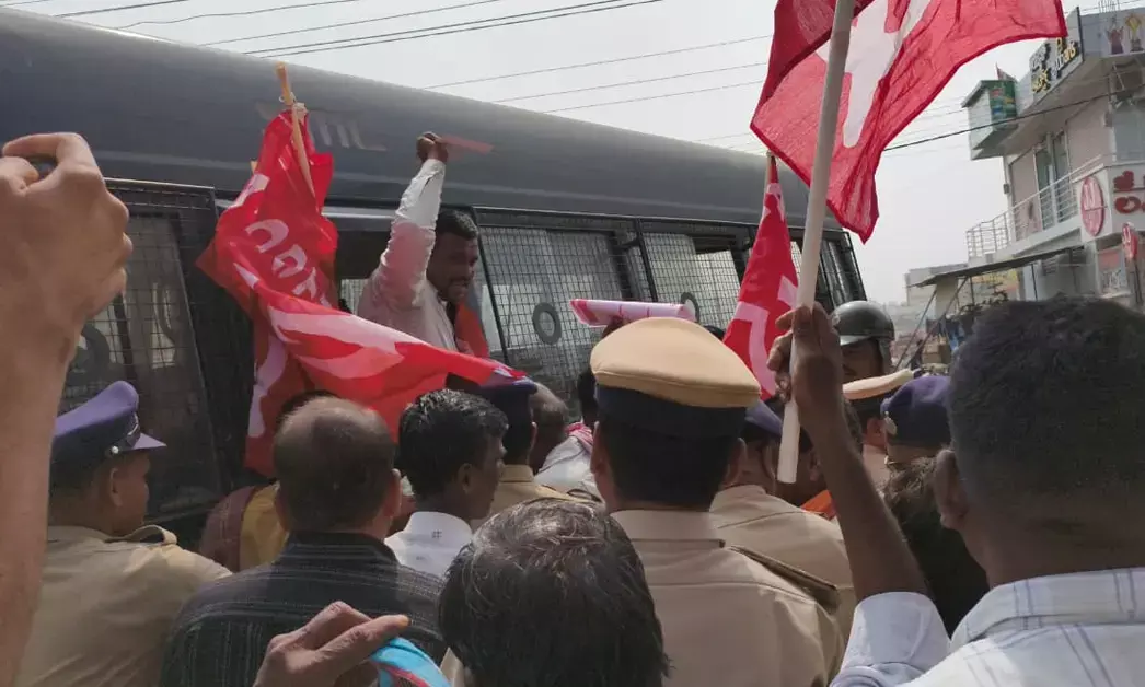 ನಗರದ ಹಳೆಯ ಜಿಲ್ಲಾಧಿಕಾರಿ ಕಚೇರಿ ಎದುರು ಜಮಾಯಿಸಿದ ಕಾರ್ಮಿಕ ಸಂಘಟನೆಯ ಮುಖಂಡರು ಮತ್ತು ಕಾರ್ಯಕರ್ತರು, ಕೇಂದ್ರ ಸರ್ಕಾರದ ವಿರುದ್ಧ ಘೋಷಣೆ ಕೂಗಿ ಆಕ್ರೋಶ ವ್ಯಕ್ತಪಡಿಸಿದರು. ಜೈಲು ಕಡೆಗೆ ಹೊರಟಿದ್ದ ಪ್ರತಿಭಟನಾಕಾರರನ್ನು ಪೊಲೀಸರು ವಶಕ್ಕೆ ಪಡೆದು ವಾಹನಗಳ ಮೂಲಕ ಕರೆದೊಯ್ದರು.