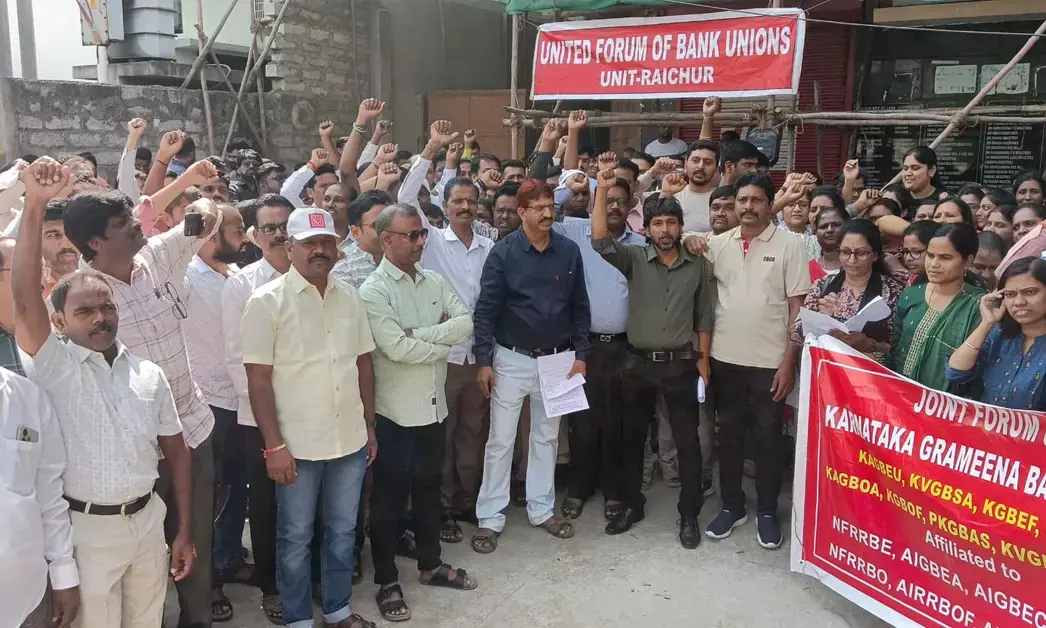 ರಾಯಚೂರು | ವಾರದಲ್ಲಿ 5 ದಿನಗಳ ಕೆಲಸ ಜಾರಿಗೆ ಒತ್ತಾಯಿಸಿ ಬ್ಯಾಂಕ್ ಉದ್ಯೋಗಿಗಳಿಂದ ಪ್ರತಿಭಟನೆ