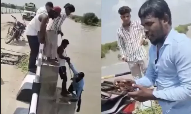 ಸೇತುವೆ ಮಾರ್ಗದಿಂದ ತೆರಳಿದ್ದ ನವದಂಪತಿ ಫೋಟೊ ತೆಗೆಸಿಕೊಳ್ಳಲು ನಿಂತಿದ್ದರು. ಮೊದಲು ಪತ್ನಿಯ ಫೋಟೊ ತೆಗೆದ ಪತಿ ಬಳಿಕ ತನ್ನ ಫೋಟೊ ತೆಗೆಯಲು ಪತ್ನಿಗೆ ಹೇಳಿದ್ದಾನೆ. ಸೇತುವೆ ತುದಿಗೆ ನಿಲ್ಲಿಸಿದ ಪತ್ನಿ ಫೊಟೊ ತೆಗೆಯುವ ನೆಪದಲ್ಲಿ ನದಿಗೆ ನೂಕಿದ್ದಾಳೆ ಎಂದು ಪತಿ ಆರೋಪಿಸಿದ್ದಾನೆ. ನದಿಯಲ್ಲಿ ಈಜಿಕೊಂಡು ಹೋಗಿ ಕಲ್ಲು ಬಂಡೆಯಲ್ಲಿ ಕುಳಿತುಕೊಂಡ ಪತಿ ರಕ್ಷಣೆಗಾಗಿ ಜೋರಾಗಿ ಕೂಗುತ್ತಿದ್ದ. ಇದನ್ನು ಗಮನಿಸಿದ ಸ್ಥಳೀಯರು ಹಗ್ಗದ ನೆರವಿನೊಂದಿಗೆ ಎರಡು ಗಂಟೆ ಕಾರ್ಯಾಚರಣೆ ನಡೆಸಿ ರಕ್ಷಣೆ ಮಾಡಿದ್ದಾರೆ. ಈ ದಂಪತಿ ಎಲ್ಲಿಯವರು, ಘಟನೆಗೆ ನಿಖರ ಕಾರಣ ಏನೆಂದು ತಿಳಿದು ಬಂದಿಲ್ಲ.