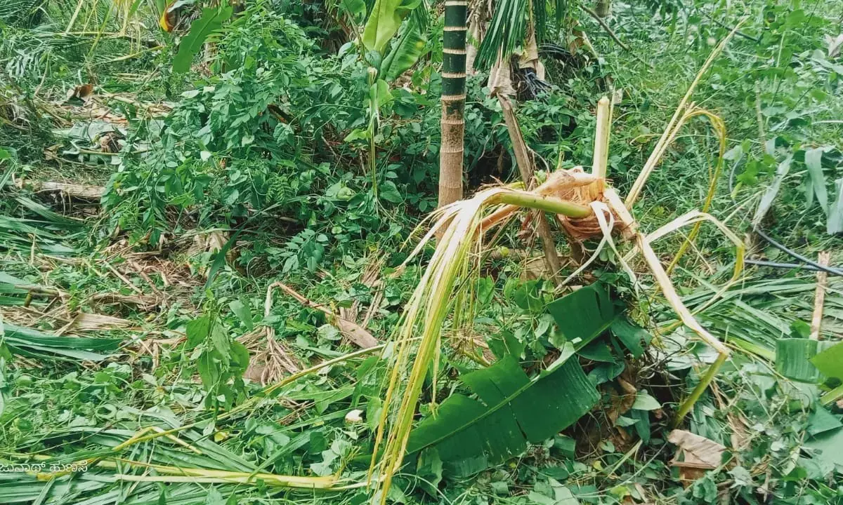 ರಾಜೇಶ್ ಮತ್ತು ಬೀರಪ್ಪ ಎಂಬವರ ತೋಟ, ಹೊಲಗಳಿಗೆ ಎರಡು ಕಾಡಾನೆಗಳು ನುಗ್ಗಿ ಹಾನಿ ಮಾಡಿವೆ. ಅಡಿಕೆ, ತೆಂಗಿನ ಮರಗಳು ಬುಡಮೇಲಾಗಿವೆ. ಜೋಳ, ಕಬ್ಬಿನ ಬೆಳೆ ಕೂಡ ಹಾನಿಯಾಗಿವೆ.