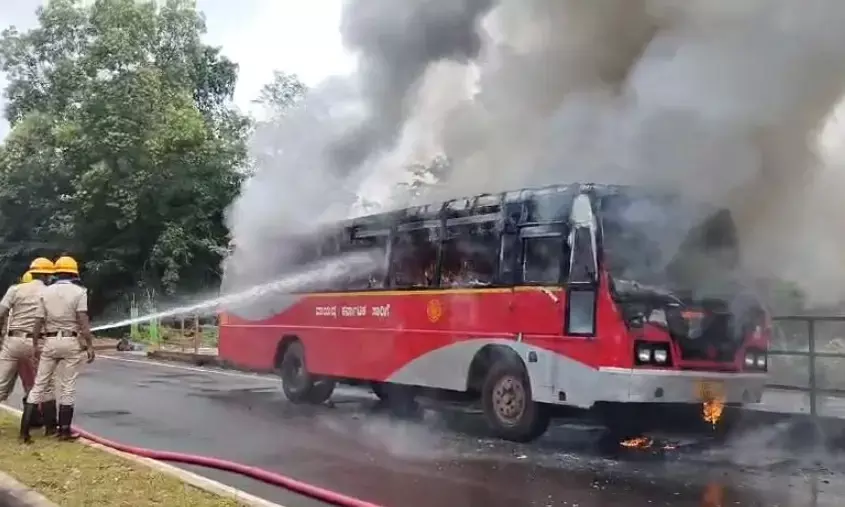 ಶಿವಮೊಗ್ಗ | ಚಲಿಸುತ್ತಿದ್ದ ಸಾರಿಗೆ ಬಸ್ ಬೆಂಕಿಗಾಹುತಿ : ಪ್ರಯಾಣಿಕರು ಅಪಾಯದಿಂದ ಪಾರು
