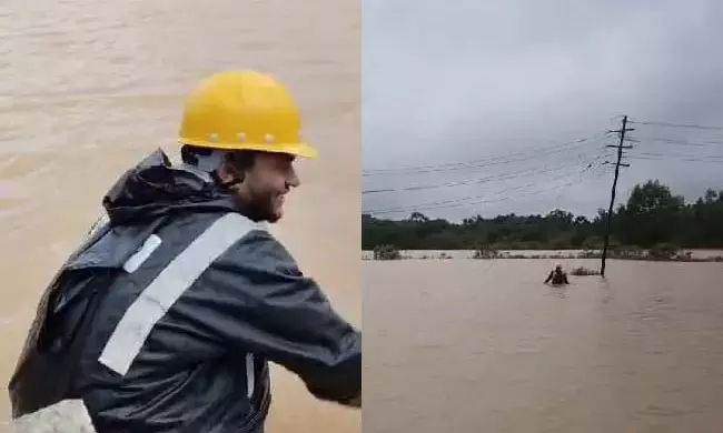 ತೀರ್ಥಹಳ್ಳಿ| ರಭಸವಾಗಿ ಹರಿಯುತ್ತಿದ್ದ ಹಳ್ಳದಲ್ಲಿ ಈಜಿ ವಿದ್ಯುತ್ ಸಂಪರ್ಕ ಸರಿಪಡಿಸಿದ ಸಿಬ್ಬಂದಿ