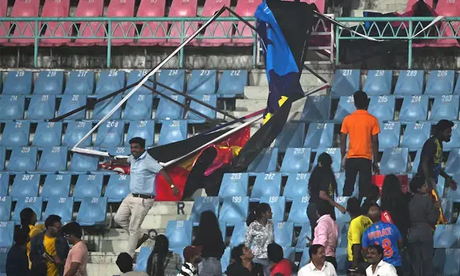 ಪಂದ್ಯದ ಎರಡನೆ ಇನಿಂಗ್ಸ್ ಪ್ರಾರಂಭಕ್ಕೂ ಮುನ್ನ ಭದ್ರತಾ ಸಿಬ್ಬಂದಿಗಳು ಪ್ರೇಕ್ಷಕರನ್ನು ಮೇಲಿನ ಆಸನಗಳಿಗೆ ಸ್ಥಳಾಂತರಿಸಿದರು.