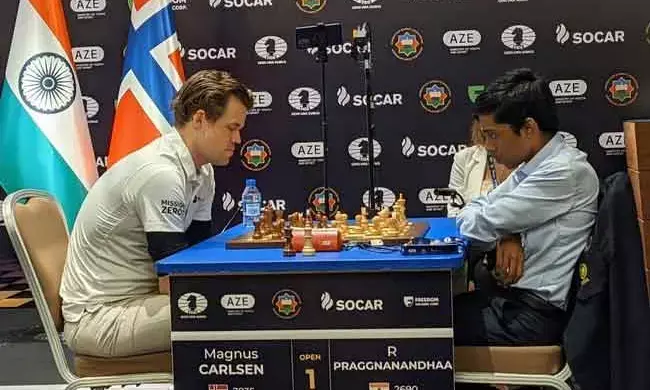 ಬಾಕು, ಆ.24: ವಿಶ್ವದ ನಂ.1 ಚೆಸ್ ಆಟಗಾರ ಮ್ಯಾಗ್ನಸ್ ಕಾರ್ಲ್ಸನ್ ಗುರುವಾರ ಭಾರತದ ಯುವ ಗ್ರಾಂಡ್ಮಾಸ್ಟರ್ ಆರ್. ಪ್ರಜ್ಞಾನಂದ ವಿರುದ್ಧ ಜಯ ಸಾಧಿಸಿ ಚೆಸ್ ವಿಶ್ವಕಪ್ನಲ್ಲಿ ಚಾಂಪಿಯನ್ ಆಗಿ ಹೊರಹೊಮ್ಮಿದ್ದಾರೆ.