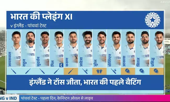 ದ ಓವಲ್ ನಲ್ಲಿ ಅಂತಿಮ ಪಂದ್ಯದಲ್ಲೂ ಆಡುವ ಬಳಗದಲ್ಲಿ ಬದಲಾವಣೆ ಮಾಡಲಾಗಿದ್ದು, ಧ್ರುವ ಜುರೆಲ್, ಕರುಣ್ ನಾಯರ್, ಆಕಾಶ್ ದೀಪ್ ಹಾಗೂ ಪ್ರಸಿದ್ಧ ಕೃಷ್ಣ ಅವರು ಪಂತ್, ಶಾರ್ದುಲ್, ಕಾಂಬೋಜ್ ಹಾಗೂ ಬುಮ್ರಾ ಬದಲಿಗೆ ಆಡಿದ್ದಾರೆ.