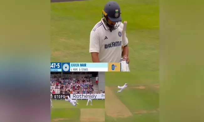 ಇಂಗ್ಲೆಂಡ್ ನಾಯಕ ಸ್ಟೋಕ್ಸ್ ಅವರ ಫುಲ್ ಔಟ್ ಸ್ವಿಂಗ್ ಎಸೆತವನ್ನು ಕೆಣಕಲು ಹೋದ ಕರುಣ್, ಶಾರ್ಟ್ ಕವರ್ ನಲ್ಲಿದ್ದ ಓಲಿ ಪೋಪ್ ಗೆ ಕ್ಯಾಚ್ ನೀಡಿದರು. ಪೋಪ್ ಆಕರ್ಷಕ ಕ್ಯಾಚ್ ಪಡೆದು ಗಮನ ಸೆಳೆದರು.