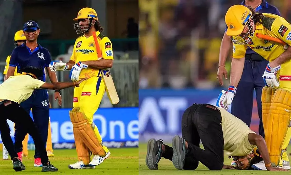 ಮೈದಾನಕ್ಕೆ ನುಗ್ಗಿ ಧೋನಿ ಕಾಲಿಗೆ ಬಿದ್ದ ಅಭಿಮಾನಿ