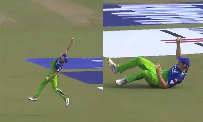ಆಸ್ಟ್ರೇಲಿಯದ ಆಲ್ರೌಂಡರ್ ಗ್ರೀನ್ ಒಂದೇ ಕೈಯಲ್ಲಿ ಕ್ಯಾಚ್ ಪಡೆದು ಕೆಕೆಆರ್ ಬ್ಯಾಟರ್ ರಘುವಂಶಿ ಅವರನ್ನು ಪೆವಿಲಿಯನ್ಗೆ ಕಳುಹಿಸಿ ತನ್ನ ಸಹ ಆಟಗಾರರಿಗೆ ಅಚ್ಚರಿ ತಂದರಲ್ಲದೆ ನೆರೆದಿದ್ದ ಪ್ರೇಕ್ಷಕರ ಮನ ಗೆದ್ದರು.