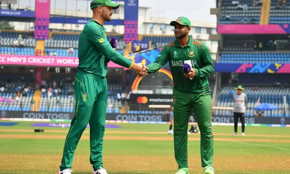 ಮುಂಬೈ : ಇಲ್ಲಿನ ವಾಂಖೆಡೆ ಸ್ಟೇಡಿಯಂನಲ್ಲಿ ನಡೆಯುತ್ತಿರುವ ವಿಶ್ವಕಪ್ ಟೂರ್ನಿಯ ಬಾಂಗ್ಲಾದೇಶ ವಿರುದ್ಧದ ಪಂದ್ಯದಲ್ಲಿ ದಕ್ಷಿಣ ಆಫ್ರಿಕಾ ತಂಡ ಟಾಸ್ ಗೆದ್ದು ಬ್ಯಾಟಿಂಗ್ ಆಯ್ದುಕೊಂಡಿದೆ.