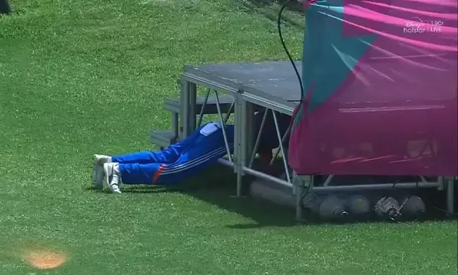 ಇನಿಂಗ್ಸ್ ನ 17ನೇ ಓವರ್ ನಲ್ಲಿ ಅರ್ಷದೀಪ್ ಸಿಂಗ್ ಎಸೆತದಲ್ಲಿ ಬಾಂಗ್ಲಾದೇಶ ತಂಡದ ರಿಶಾದ್ ಹುಸೈನ್ ಸಿಕ್ಸರ್ ಬಾರಿಸಿದ್ದರು. ಈ ವೇಳೆ ಬೌಂಡರಿಯಲ್ಲಿ ಫೀಲ್ಡಿಂಗ್ ಮಾಡುತ್ತಿದ್ದ ಕೊಹ್ಲಿ ಬೌಂಡರಿ ದಾಟಿದ್ದ ಚೆಂದು ತರಲು ಓಡಿದರು. ಆದರೆ ಚೆಂಡು ಪಟಾಕಿ ಸಿಡಿಸುವ ವೇದಿಕೆಯ ಕೆಳಗೆ ನುಗ್ಗಿತ್ತು. ಚೆಂಡು ತೆಗೆಯಲು ವಿರಾಟ್ ಕೊಹ್ಲಿ ಮಕ್ಕಳಂತೆ ವೇದಿಕೆ ಕೆಳಗೆ ನುಗ್ಗಿದರು.