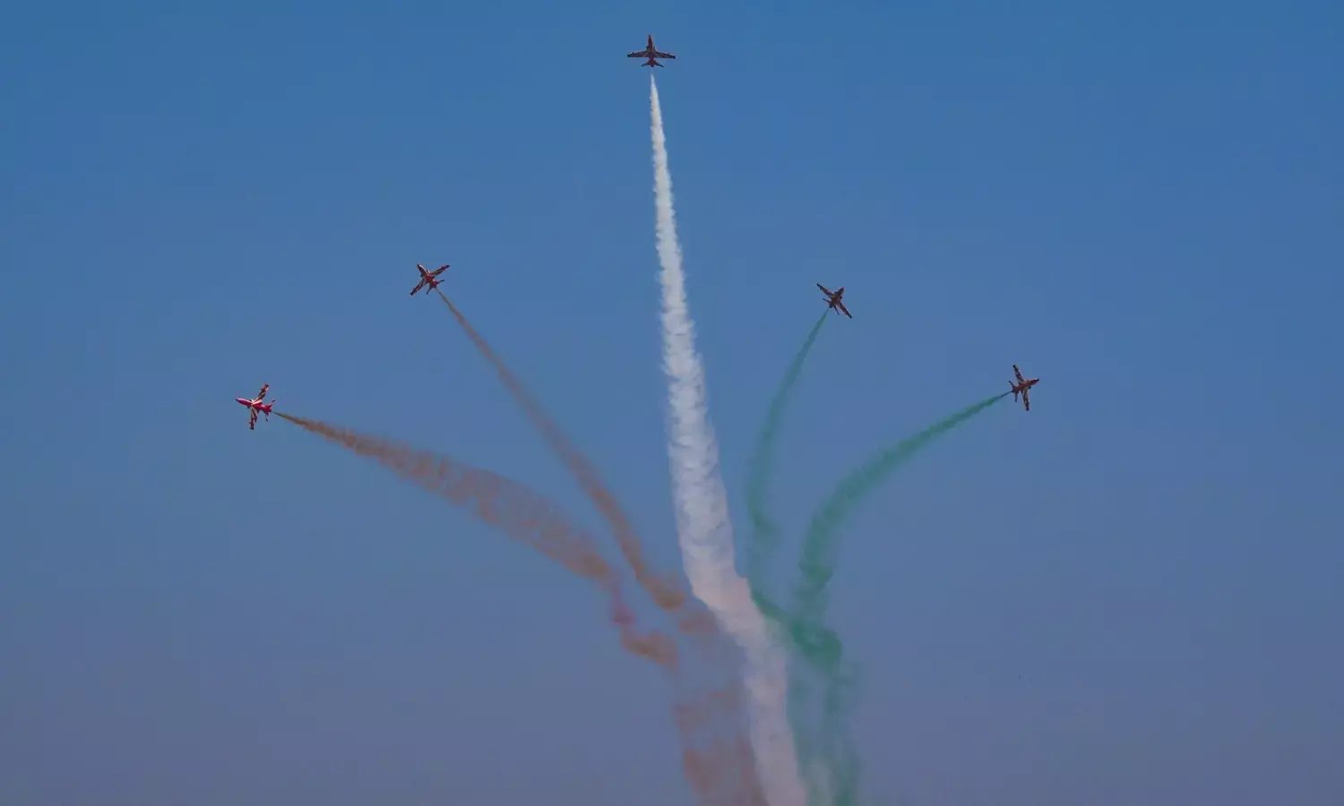 ಯಲಹಂಕ ಏರ್ ಫೋರ್ಸ್ ಸ್ಟೇಷನ್ನಲ್ಲಿ ಜೆಟ್ಗಳು ತ್ರಿವರ್ಣ ಹೊಗೆ ಹೊರಸೂಸುತ್ತಾ ಹಾರಾಟ ನಡೆಸಿದವು. ಆಕಾಶಗಂಗೆ ತಂಡದಿಂದ ಪ್ಯಾರಾಚೂಟ್ಗಳಿಂದ ಸೈನಿಕರು ವಾಯುನೆಲೆಯ ರನ್ ವೇ ಬಳಿ ತ್ರಿವರ್ಣ ಧ್ವಜ ಹೊತ್ತು ಇಳಿದರು. ವೈಮಾನಿಕ ಪ್ರದರ್ಶನದಲ್ಲಿ ಭಾರತವು ಸ್ಥಳೀಯವಾಗಿ ಅಭಿವೃದ್ಧಿಪಡಿಸಿದ ಏಕ-ಎಂಜಿನ್ ಮಲ್ಟಿರೋಲ್ ಫೈಟರ್, ಎಚ್ಎಎಲ್ನ ತೇಜಸ್ ಅನ್ನು ಪ್ರದರ್ಶಿಸಲಾಗಿದೆ.