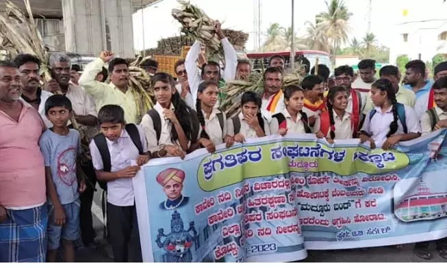 ಕಾವೇರಿದ ಕಾವೇರಿ ಹೋರಾಟ | ಮದ್ದೂರಿನಲ್ಲಿ ರೈತರ ಪ್ರತಿಭಟನೆಯಲ್ಲಿ ಕಾಲೇಜು ವಿದ್ಯಾರ್ಥಿಗಳ ಭಾಗಿ