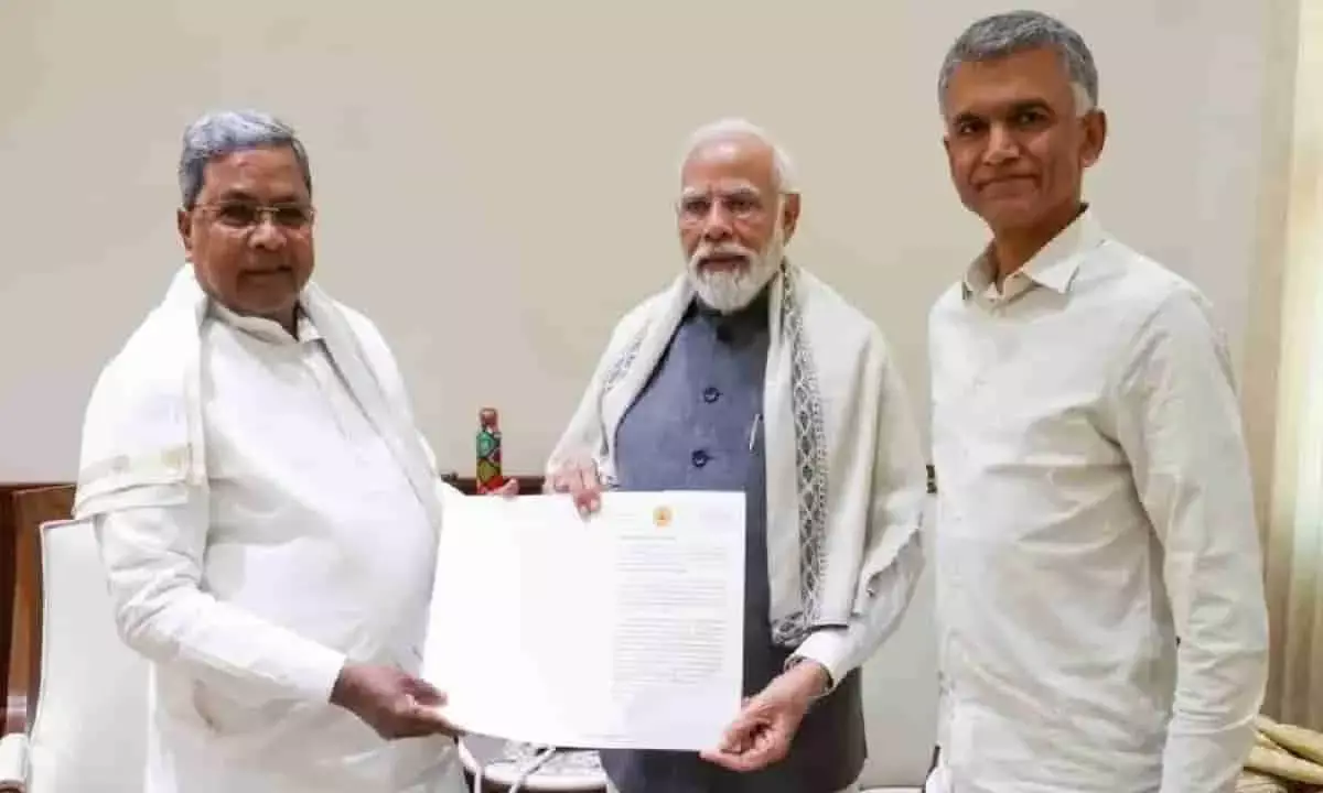 ಬರಪರಿಹಾರಕ್ಕಾಗಿ ಮುಖ್ಯಮಂತ್ರಿ ಸಿದ್ದರಾಮಯ್ಯ, ಕಂದಾಯ ಸಚಿವ ಕೃಷ್ಣಬೈರೇಗೌಡ ಅವರು ದೆಹಲಿಯಲ್ಲಿ ಪ್ರಧಾನಿ ನರೇಂದ್ರ ಮೋದಿ ಅವರನ್ನು ಭೇಟಿಯಾಗಿದ್ದ ಸಂದರ್ಭ