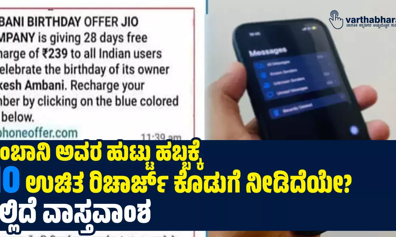 ಬೆಂಗಳೂರು: ʼʼಅಂಬಾನಿ ಅವರ ಹುಟ್ಟು ಹಬ್ಬಕ್ಕೆ ಜಿಯೊ ಕಂಪೆನಿಯು ಎಲ್ಲಾ ಬಳಕೆದಾರರಿಗೆ 239 ಮೌಲ್ಯದ 28 ದಿನಗಳ ಅವಧಿಯ ರೀಚಾರ್ಜ್ ಅನ್ನು ಉಚಿತವಾಗಿ ನೀಡುತ್ತಿದೆʼʼ ಎಂಬ ಸಂದೇಶವೊಂದು ಸಾಮಾಜಿಕ ಜಾಲತಾಣಗಳಲ್ಲಿ ಹರಿದಾಡುತ್ತಿದ್ದು, ಇದು ನಿಜವಾದ ಮಾಹಿತಿಯಲ್ಲ, ಬದಲಿಗೆ ಮೋಸಗಾರರ ಮೋಸದ ಜಾಲವಾಗಿದೆ.