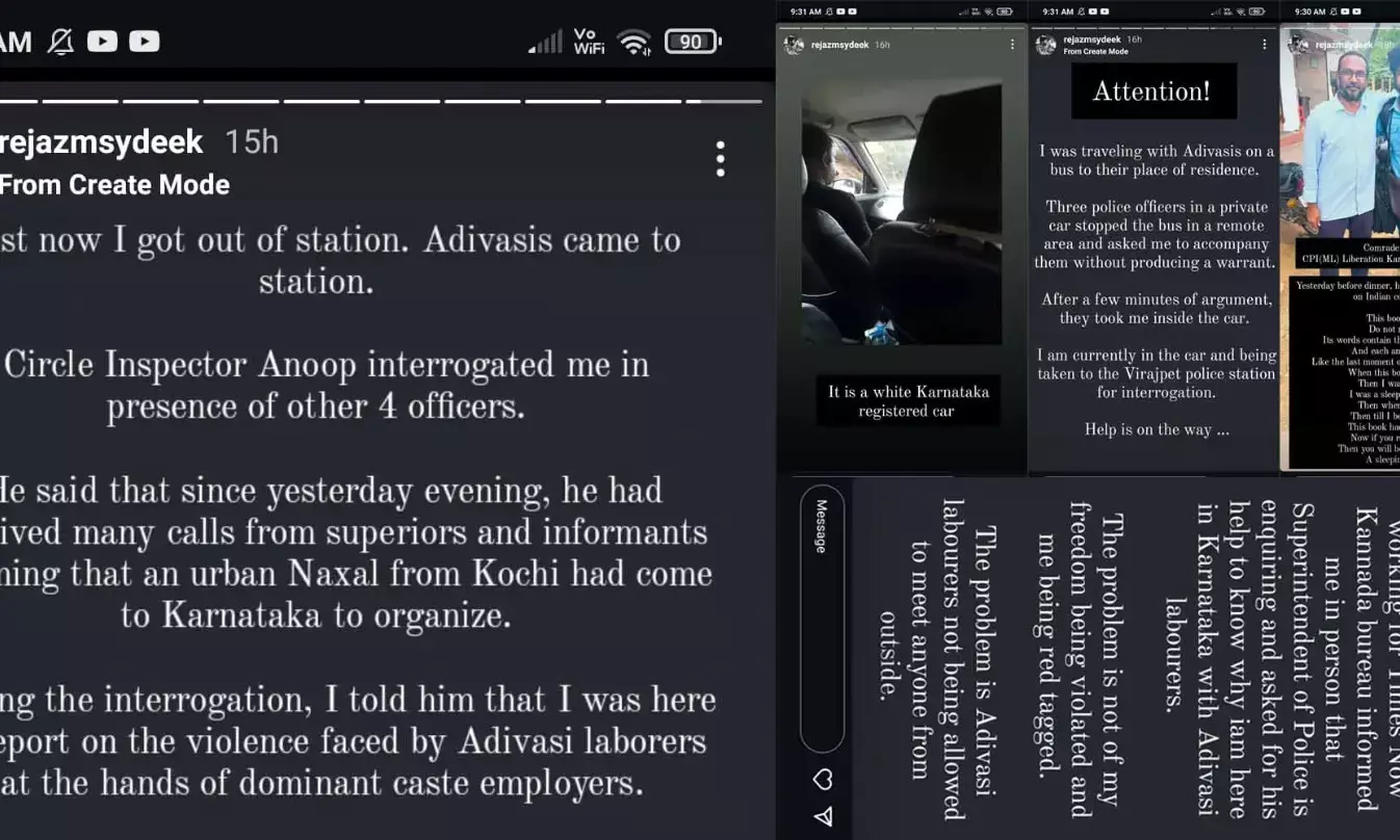 ಬಿಡುಗಡೆ ನಂತರ ಇನ್ಸ್ಟಾ ಗ್ರಾಂ ಸ್ಟೋರಿ ಹಾಕಿರುವ ಪತ್ರಕರ್ತ "ಈಗಷ್ಟೇ ನಾನು ಠಾಣೆಯಿಂದ ಹೊರಬಂದೆ. ಆದಿವಾಸಿಗಳು ಠಾಣೆಗೆ ಬಂದರು. ಸರ್ಕಲ್ ಇನ್ಸ್ಪೆಕ್ಟರ್ ಅನೂಪ್ ಇತರ 4 ಅಧಿಕಾರಿಗಳ ಸಮ್ಮುಖದಲ್ಲಿ ನನ್ನ ವಿಚಾರಣೆ ನಡೆಸಿದರು. ನಿನ್ನೆ ಸಂಜೆಯಿಂದ, ಕೊಚ್ಚಿಯಿಂದ ಅರ್ಬನ್ ನಕ್ಸಲ್ ಕರ್ನಾಟಕಕ್ಕೆ ಸಂಘಟಿಸಲು ಬಂದಿದ್ದಾನೆ ಎಂದು ಮೇಲಧಿಕಾರಿಗಳು ಮತ್ತು ಮಾಹಿತಿದಾರರಿಂದ ನನಗೆ ಅನೇಕ ಕರೆಗಳು ಬಂದಿವೆ ಎಂದು ಅವರು ಹೇಳಿದರು. ವಿಚಾರಣೆಯ ಸಮಯದಲ್ಲಿ, ಪ್ರಬಲ ಜಾತಿಯ ಉದ್ಯೋಗದಾತರಿಂದ ಆದಿವಾಸಿ ಕಾರ್ಮಿಕರು ಎದುರಿಸುತ್ತಿರುವ ಹಿಂಸಾಚಾರದ ಬಗ್ಗೆ ವರದಿ ಮಾಡಲು ನಾನು ಇಲ್ಲಿದ್ದೇನೆ ಎಂದು ನಾನು ಅವರಿಗೆ ಹೇಳಿದೆ. ಕೇರಳದ ಯಾರಾದರೂ ಇಲ್ಲಿ ಏಕೆ ಇದ್ದಾರೆ ಎಂದು ಕೇಳಿದಾಗ, ಮುಖ್ಯವಾಹಿನಿಯ ಮಾಧ್ಯಮಗಳು ಈ ವಿಷಯದ ಬಗ್ಗೆ ವರದಿ ಮಾಡದ ಕಾರಣ, ನಾನು ಸ್ವಯಂಪ್ರೇರಿತವಾಗಿ ಬಂದು ಅದರ ಬಗ್ಗೆ ವರದಿ ಮಾಡಿದ್ದೇನೆ ಎಂದು ನಾನು ಉತ್ತರಿಸಿದೆ. ಆದಿವಾಸಿಗಳಿಗೆ ವಿಳಂಬವಾದ ಸರ್ಕಾರಿ ಪರಿಹಾರದ ಕುರಿತು ನಮ್ಮ ಮಾತುಕತೆ ಸಮಯದಲ್ಲಿ, "ನ್ಯಾಯ ವಿಳಂಬವಾದರೆ ನ್ಯಾಯ ನಿರಾಕರಿಸಲಾಗಿದೆ" ಎಂದರ್ಥ ಎಂದು ನಾನು ಉಲ್ಲೇಖಿಸಿದೆ. ಇನ್ಸ್ಪೆಕ್ಟರ್ ಪ್ರತಿಕ್ರಿಯಿಸಿ ನಾನು ನಕ್ಸಲ್ನಂತೆ ಮಾತನಾಡುತ್ತಿದ್ದೇನೆ ಎಂದು ಹೇಳಿದರು. ದೆಹಲಿಯಲ್ಲಿ ನನ್ನ ವಿರುದ್ಧ ಒಂದು ಪ್ರಕರಣವಿದೆ ಎಂದು ಅವರು ಉಲ್ಲೇಖಿಸಿದ್ದಾರೆ. ನನಗೆ ಈ ಪ್ರಕರಣ ವಿಷಯ ತಿಳಿದಿರಲಿಲ್ಲ ಎಂದು ಪತ್ರಕರ್ತ ರಿಜಾಸ್ ಇನ್ಸ್ಟಾಗ್ರಾಮ್ ಸ್ಟೋರಿ ಯಲ್ಲಿ ಹೇಳಿದ್ದಾರೆ.