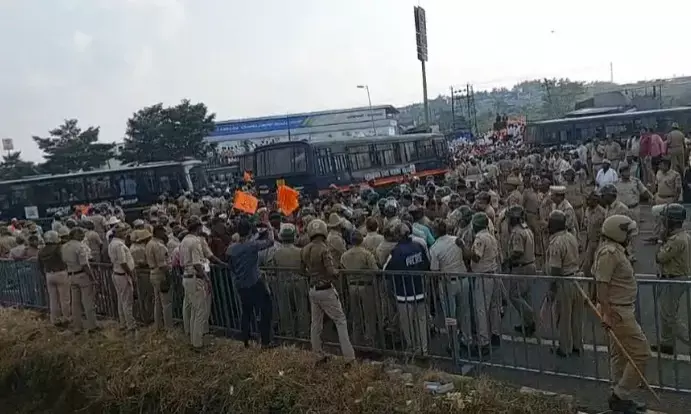 ಟ್ರ್ಯಾಕ್ಟರ್ಗಳಲ್ಲಿ ಬರುತ್ತಿದ್ದವರನ್ನು ವಶಕ್ಕೆ ಪಡೆದ ಪೊಲೀಸರು: ಪ್ರತಿಭಟನಾ ಸಭೆಗೆ ಸುಮಾರು 50ಕ್ಕೂ ಹೆಚ್ಚು ಟ್ರ್ಯಾಕ್ಟರ್ಗಳಲ್ಲಿ ಆಗಮಿಸುತ್ತಿದ್ದವರನ್ನು ಹಿರೇಬಾಗೇವಾಡಿಯಲ್ಲಿ ಪೊಲೀಸರು ವಶಕ್ಕೆ ಪಡೆದುಕೊಂಡರು. ಜಿಲ್ಲಾಡಳಿತವು ಟ್ರ್ಯಾಕ್ಟರ್ ರ್ಯಾಲಿಗೆ ನಿಷೇಧ ಹೇರಿದ್ದರೂ ಹೋರಾಟಗಾರರು ಟ್ರ್ಯಾಕ್ಟರ್ಗಳಲ್ಲಿ ಪ್ರತಿಭಟನಾ ಸ್ಥಳಕ್ಕೆ ಆಗಮಿಸುತ್ತಿದ್ದರು.