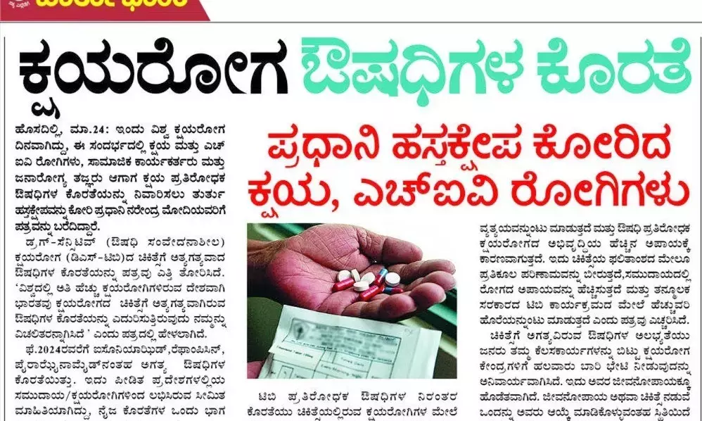 ಹಾಲಿ ಕ್ಷಯ ರೋಗಿಗಳ ಚಿಕಿತ್ಸೆಗೆ ಬೇಕಾಗಿರುವ 3 ಎಫ್ಡಿಸಿ ಮಾತ್ರೆಗಳ ಪೂರೈಕೆಯಲ್ಲಿ ವ್ಯತ್ಯಯ ಉಂಟಾಗಿದ್ದರಿಂದ ರೋಗಿಗಳಿಗೆ ವಿತರಿಸಲು ಅನಾನುಕೂಲವಾಗಿದೆ. ಸದರಿ ತೊಂದರೆ ನಿವಾರಣೆ ಮಾಡಲು ಎಲ್ಲಾ ಜಿಲ್ಲಾ ಆಸ್ಪತ್ರೆಗಳು ಮತ್ತು ತಾಲೂಕು ಆಸ್ಪತ್ರೆಗಳು ತಮ್ಮಲ್ಲಿ ಲಭ್ಯವಿರುವ ಎಬಿಎಆರ್ಕೆ ಅನುದಾನದಲ್ಲಿ ಔಷಧಿಗಳನ್ನು ಸ್ಥಳೀಯವಾಗಿ ಖರೀದಿಸಿ ತಮ್ಮ ವ್ಯಾಪ್ತಿಯಲ್ಲಿ ಬರುವ ರೋಗಿಗಳಿಗೆ ಒದಗಿಸಿ ಔಷಧಿ ಕೊರತೆಯನ್ನು ನೀಗಿಸಬೇಕು ಎಂದು ಆಯುಕ್ತರು ಈಗಾಗಲೇ ಸುತ್ತೋಲೆ ಹೊರಡಿಸಿದ್ದಾರೆ ಎಂದು ಪ್ರಕಟಣೆ ತಿಳಿಸಿದೆ.