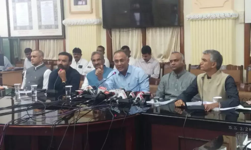 ವಿಧಾನಸೌಧದಲ್ಲಿ ಸಚಿವರಾದ ಕೃಷ್ಣಭೈರೇಗೌಡ, ದಿನೇಶ್ ಗುಂಡೂರಾವ್, ಕೆಜೆ ಜಾರ್ಜ್, ಪ್ರಿಯಾಂಕ್ ಖರ್ಗೆ, ಸಂತೋಷ್ ಲಾಡ್ ಸುದ್ದಿಗೋಷ್ಠಿ ನಡೆಸಿದರು.