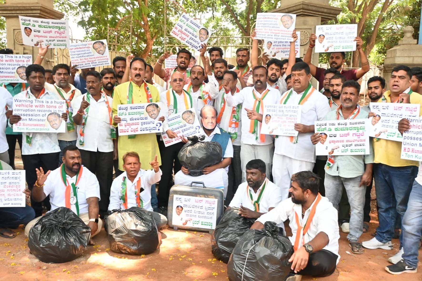 ಬೆಂಗಳೂರು: ‘ಉಪಮುಖ್ಯಮಂತ್ರಿ ಡಿ.ಕೆ.ಶಿವಕುಮಾರ್ ಅವರ ಅಕ್ರಮಗಳ ದಾಖಲೆ ಟನ್ ಗಟ್ಟಲೆ ಇದೆ. ಎಲ್ಲವನ್ನೂ ಬಿಡುಗಡೆ ಮಾಡುತ್ತೇನೆ’ ಎಂಬ ಕೇಂದ್ರ ಸಚಿವ ಎಚ್.ಡಿ.ಕುಮಾರಸ್ವಾಮಿ ಅವರ ಹೇಳಿಕೆ ವಿರುದ್ಧ ಕಾಂಗ್ರೆಸ್ ಮುಖಂಡರು ಶನಿವಾರ ನಗರದ ಹಳೆ ಕಾಂಗ್ರೆಸ್ ಕಚೇರಿಯಲ್ಲಿ ಪ್ರತಿಭಟನೆ ನಡೆಸಿ ವಾಹನ ತೆಗೆದುಕೊಂಡು ದಾಖಲೆಗಳ ಬಿಡುಗಡೆ ಮಾಡುವಂತೆ ಒತ್ತಾಯಿಸಿದ್ದಾರೆ.