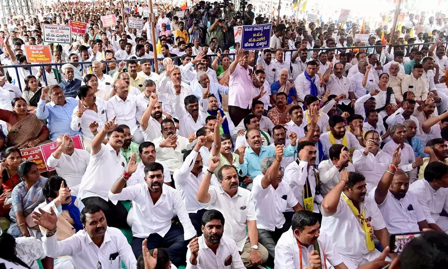 ಮಂಗಳವಾರ ನಗರದ ಫ್ರೀಡಂ ಪಾರ್ಕಿನ ಮೈದಾನದಲ್ಲಿ ‘ಕರ್ನಾಟಕ ಶೋಷಿತ ಸಮುದಾಯಗಳ ಮಹಾಒಕ್ಕೂಟ ಮತ್ತು ಕರ್ನಾಟಕ ರಾಜ್ಯ ಹಿಂದುಳಿದ ಜಾತಿಗಳ ಒಕ್ಕೂಟ’ ನೇತೃತ್ವದಲ್ಲಿ ಜಮಾಯಿಸಿದ ಅಹಿಂದ ಸಮುದಾಯದ ನಾಯಕರು ಹಾಗೂ ಕಾಂಗ್ರೆಸ್ ಮುಖಂಡರು ಬೃಹತ್ ಪ್ರತಿಭಟನಾ ಸಮಾವೇಶ ನಡೆಸಿ, ಕೇಂದ್ರ ಸರಕಾರ ಹಾಗೂ ರಾಜ್ಯಪಾಲ ಥಾವರ್ ಚಂದ್ ಗೆಹ್ಲೋಟ್ ವಿರುದ್ಧ ತೀವ್ರ ವಾಗ್ದಾಳಿ ನಡೆಸಿದರು.