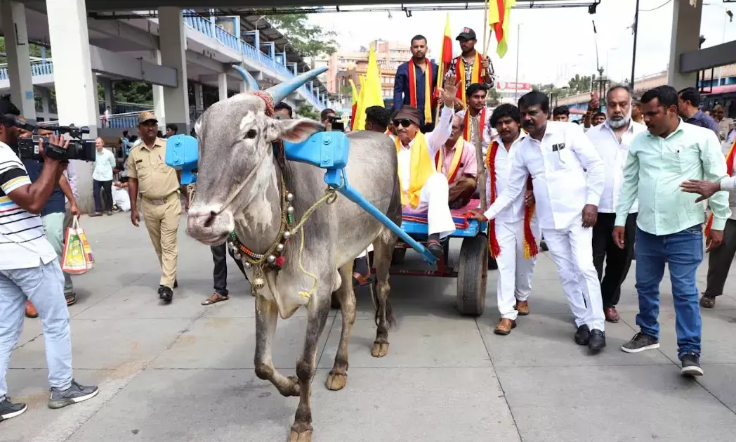 ಬೆಂಗಳೂರಿನಲ್ಲಿರುವ ಎಲ್ಲ ಗುಂಡಿಗಳನ್ನು ಮುಚ್ಚುವಂತೆ ಆಗ್ರಹಿಸಿ, ಶನಿವಾರ ನಗರದ ಕೆಂಪೇಗೌಡ ಬಸ್ ನಿಲ್ದಾಣದ ಹತ್ತಿರ ‘ಎತ್ತಿನ ಬಂಡಿ’ ಓಡಿಸುವ ಮೂಲಕ ವಿನೂತನ ಚಳವಳಿ ನಡೆಸಿ, ಅವರು ಮಾತನಾಡಿದರು.