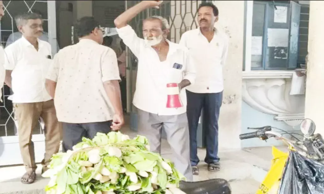 Tumakuru | ಜಮೀನಿಗೆ ರಸ್ತೆ ಮಾಡಿಕೊಡದ ಅಧಿಕಾರಿಗಳು; ಮೂಲಂಗಿಯನ್ನೇ ಲಂಚವಾಗಿ ನೀಡಲು ಬಂದ ರೈತ