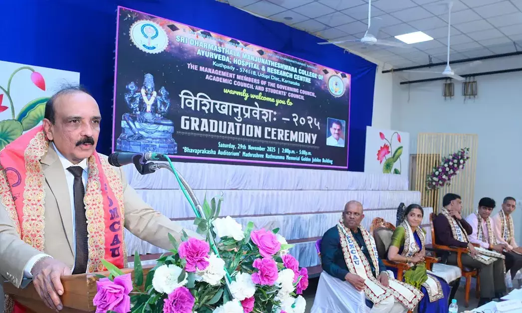 ಉದ್ಯಾವರ ಸಮೀಪದ ಕುತ್ಪಾಡಿಯಲ್ಲಿರುವ ಶ್ರೀಧರ್ಮಸ್ಥಳ ಮಂಜುನಾಥೇಶ್ವರ ಆಯುರ್ವೇದ ಕಾಲೇಜು, ಆಸ್ಪತ್ರೆ ಹಾಗೂ ಸಂಶೋಧನಾ ಕೇಂದ್ರದ ಭಾವಪ್ರಕಾಶ ಸಭಾಂಗಣದಲ್ಲಿ ಇಂದು ಸಂಜೆ ನಡೆದ ಕಾಲೇಜಿನ ‘ವಿಶಿಖಾನುಪ್ರವೇಶ’ ಪದವಿ ಪ್ರದಾನ ಸಮಾರಂಭದಲ್ಲಿ ಮುಖ್ಯ ಅತಿಥಿಯಾಗಿ ಭಾಗವಹಿಸಿ ಪದವಿ ಪಡೆದ ವಿದ್ಯಾರ್ಥಿಗಳಿಗೆ ಪದವಿ ಹಾಗೂ ಚಿನ್ನದ ಪದಕಗಳನ್ನು ವಿತರಿಸಿ ಮಾತನಾಡುತ್ತಿದ್ದರು.