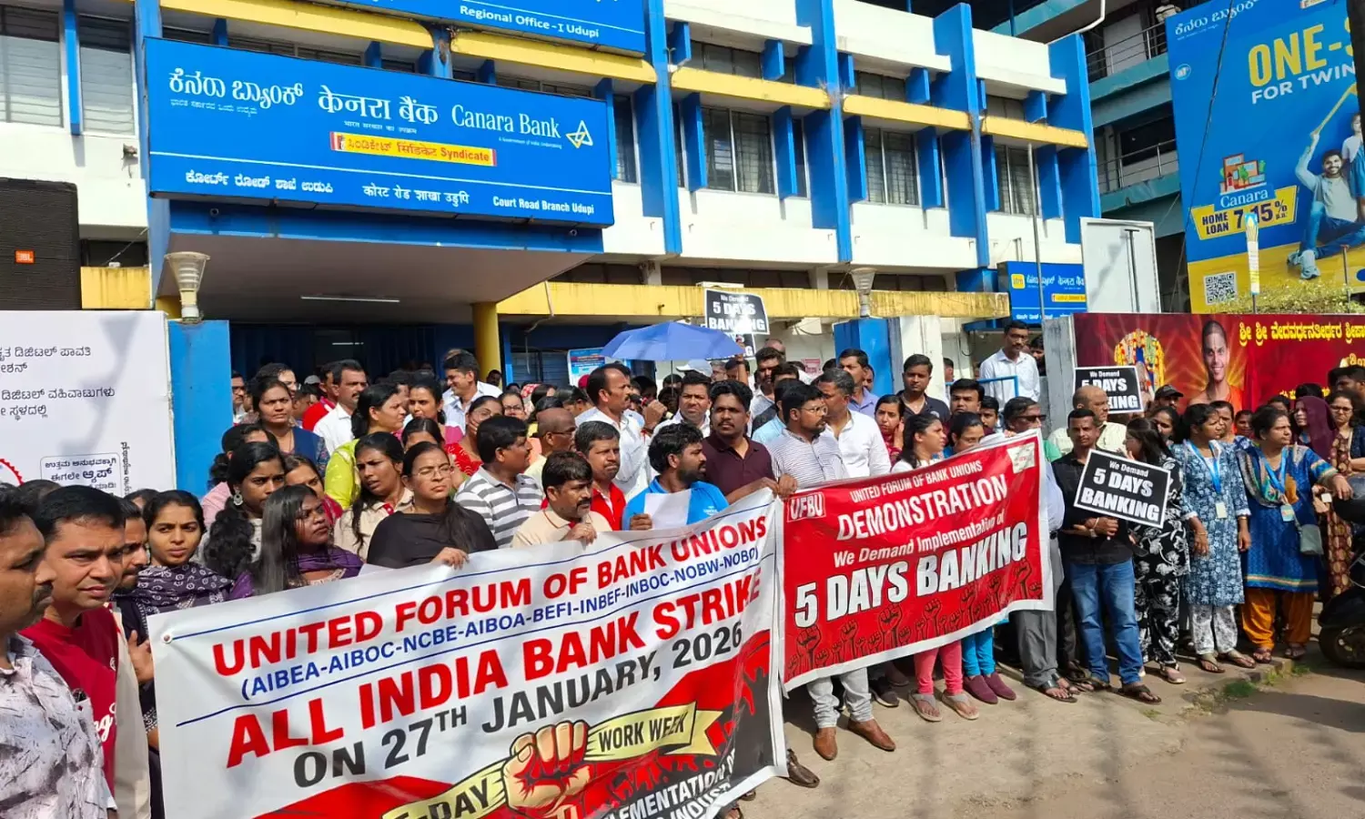 ಉಡುಪಿ ಜಿಲ್ಲಾ ಅಖಿಲ ಭಾರತೀಯ ಬ್ಯಾಂಕ್ ಸಂಘ (ಯುಎಫ್ಬಿಯು)ಗಳ ಮುಖಂಡರು ಉಡುಪಿ ಕೋರ್ಟ್ ರಸ್ತೆಯ ಕೆನರಾ ಬ್ಯಾಂಕ್ ಶಾಖೆಯ ಮುಂದೆ ಧರಣಿ ನಡೆಸಿದರು. ವಾರದಲ್ಲಿ ಐದು ದಿನ ಮಾತ್ರ ಕೆಲಸದಲ್ಲಿ ತೊಡಗಿ ಸಿಕೊಂಡು ಉಳಿದ ಎರಡು ದಿನ ರಜೆ ಜಾರಿ ಮಾಡಬೇಕೆಂದು ಆಗ್ರಹಿಸಿದರು.