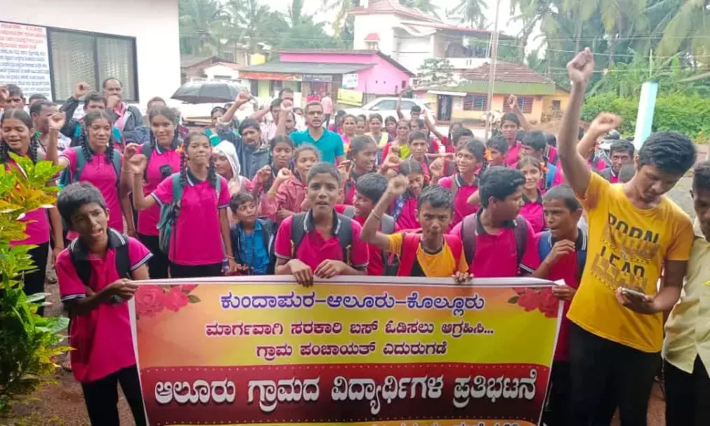 ಕುಂದಾಪುರ, ಆ.5: ಕೊಲ್ಲೂರು-ಆಲೂರು-ಕುಂದಾಪುರ ಮಾರ್ಗವಾಗಿ ಸರಕಾರಿ ಬಸ್ ಓಡಿಸುವಂತೆ ಆಗ್ರಹಿಸಿ ಆಲೂರು ಗ್ರಾಮದ ವಿದ್ಯಾರ್ಥಿಗಳು ಇಂದು ಧರಣಿ ನಡೆಸಿದರು.