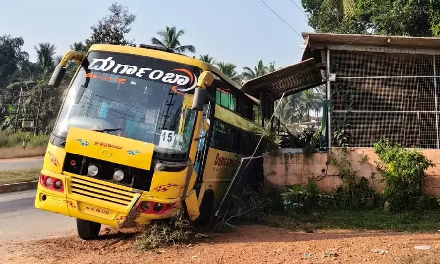 ಹಿರಿಯಡ್ಕ | ಚರಂಡಿಗೆ ಬಿದ್ದ ಬಸ್: ಹೊಟೇಲ್ ಜಖಂ