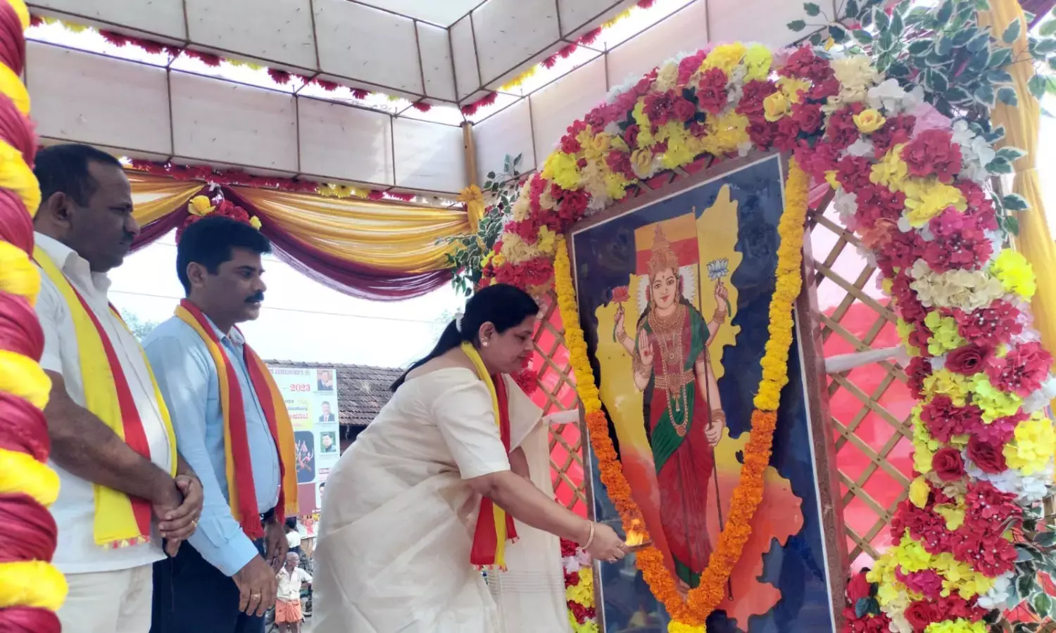 ಕಾರ್ಕಳ, ನ.1: ಕಾರ್ಕಳದಲ್ಲಿ ನಡೆದ ಕನ್ನಡ ರಾಜ್ಯೋತ್ಸವ ಸಂಭ್ರಮಾಚರಣೆಯಲ್ಲಿ ಕಾರ್ಕಳ ಪುರಸಭೆ ಮುಖ್ಯಾಧಿಕಾರಿ ರೂಪಾ ಟಿ. ಶೆಟ್ಟಿ ಕಾರ್ಕಳ ಅನಂತಶಯನ ವೃತ್ತದಲ್ಲಿ ಕನ್ನಡ ಭುವನೇಶ್ವರಿ ಭಾವಚಿತ್ರಕ್ಕೆ ಆರತಿ ಎತ್ತಿ, ತಿಲಕವಿಟ್ಟು, ಪುಷ್ಪಾರ್ಚನೆ ಮಾಡಿದರು.